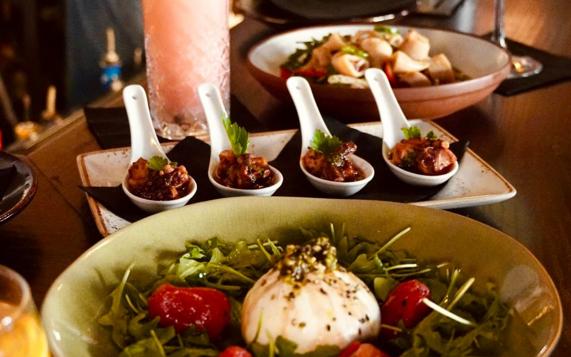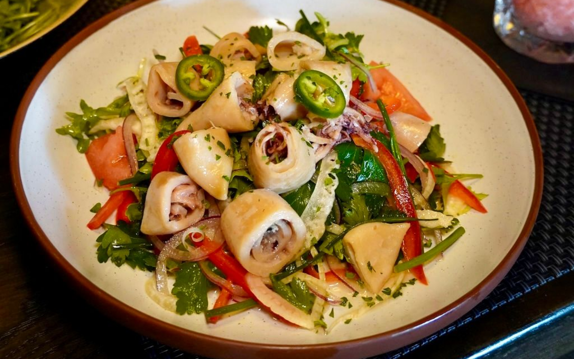 Scallion dressing – micro cilantro – roasted bell pepper & serrano sauce